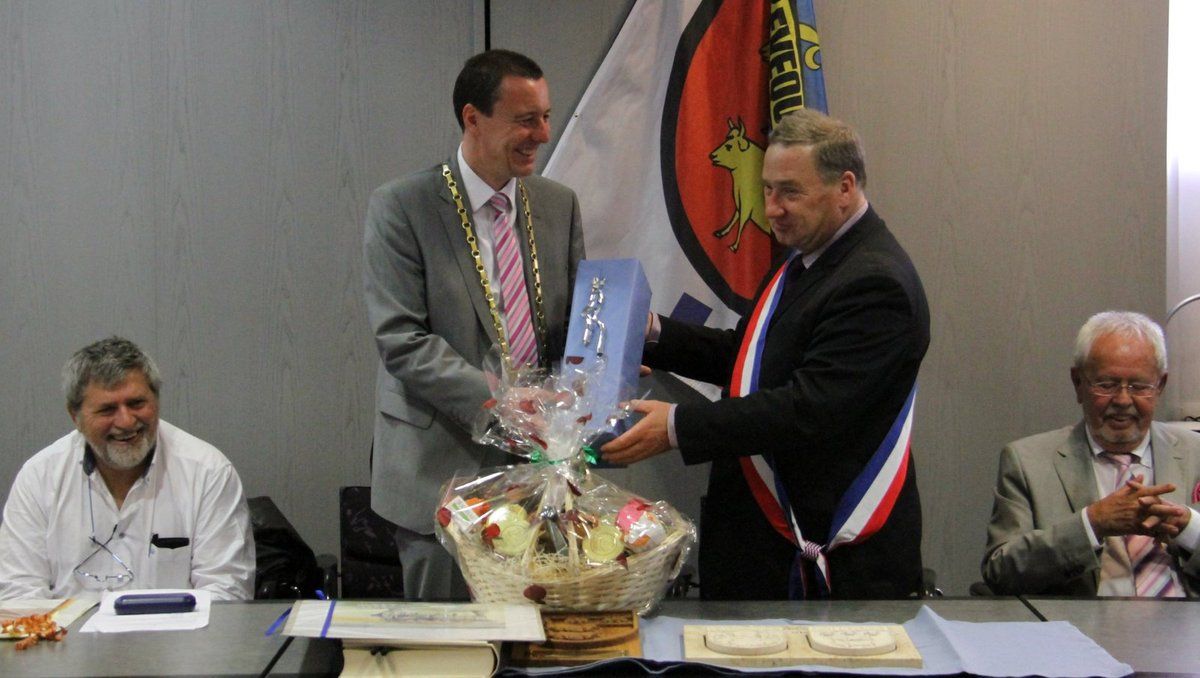 Wie bei solchen Anlässen üblich, steht auch der Austausch von Geschenken wie auf den Fotos zu sehen, von Postern, Präsentkörben und Getränkespezialitäten der jeweiligen Region auf der Tagesordnung. Auch erinnern in beiden Kommunen Steinwappen an das 20jährige Jubiläum, die sich die beiden Bürgermeister gegenseitig überreichten.