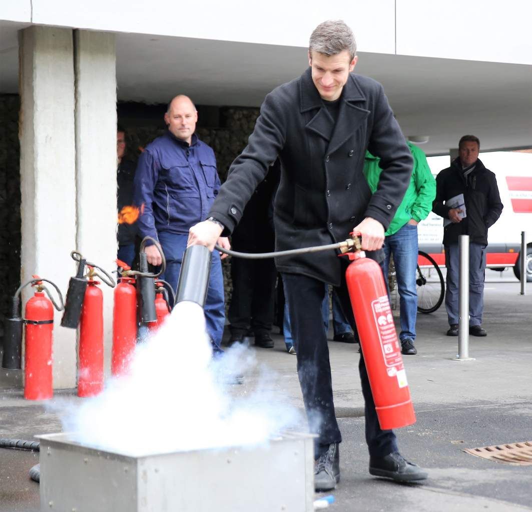Zum Abschluss stellte der Vertreter einer Fachfirma noch die verschiedenen Arten von Feuerlöschern und ihren Einsatz in den unterschiedlichen Brandschutzklassen vor und gab eine Unterweisung in der richtigen Handhabung, um die Angst für den Ernstfall zu nehmen.