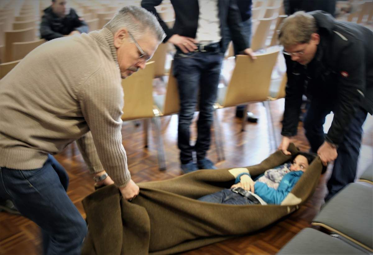 Geübt wurde beim Workshop als weiteres Szenario die Erstversorgung einer ohnmächtig gewordenen Besucherin, das Absetzen einer Meldung und im Falle einer Räumung deren Abtransport.
