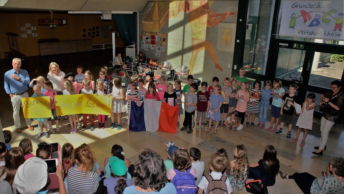 Bereits am Abend zuvor hatten die Frühfranzösischkinder der Grundschule die Gäste aus der Partnerstadt mit Willkommensplakaten "Bonjour chez nous les amis!" (mit Unterschrift aller 37 Französischkinder der Schule), sowie Frankreich-Fähnchen schwingend, singend begrüßt. Die Gäste hatten sich sehr gefreut, als die Kinder jedem von ihnen ein selbstgemachtes "Willkommensgeschenk", ein Papierherzchen überreichten, auf dem "Willkommen in Veitshöchheim" stand, mit Name und Alter des Kindes.