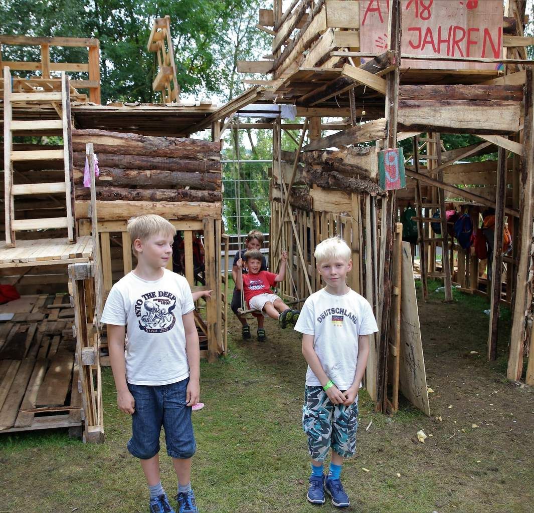 Abenteuer beim Hüttenbau, Spaß, gute Laune, Zeit mit Freunden, Wasserschlacht, lecker Essen, Spiele, dies alles gab es zu Hauf für die 200 Kinder im Alter zwischen sieben und 13 Jahre, die in dieser Woche von Montag bis Freitag den ausgebuchten Abenteuerspielplatz Holznagelhausen auf der Wiese nördlich des Mainstegs besucht hatten, so auch für diese Jungs, die sich nach vollendetem Werk auf der Dachterrasse ihrer Hütte sonnen und voller Coolness von oben das Treiben beim Grillfest beobachten.