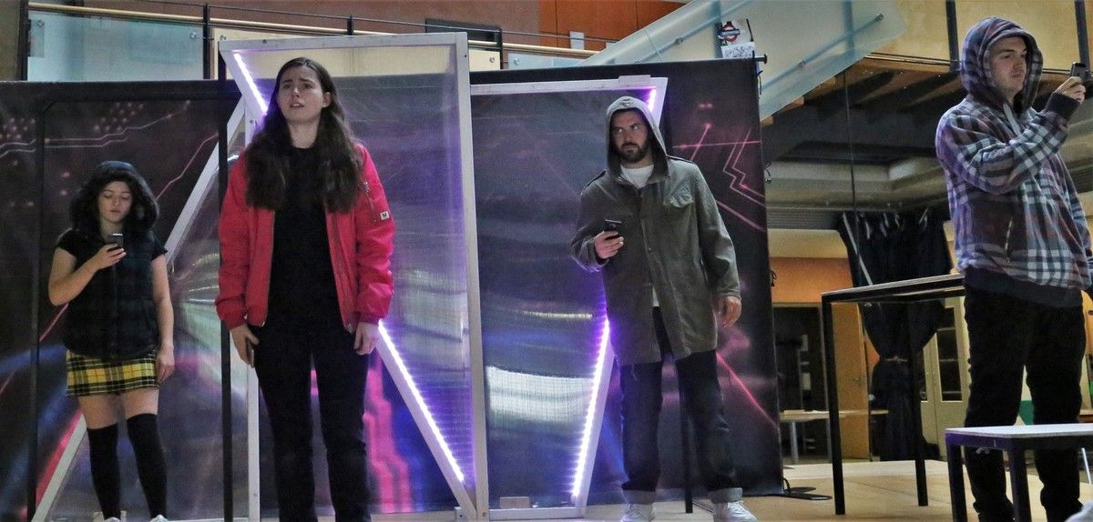 Vier Jugendliche kommen auf die Bühne. Jeder hat den Blick in sein Handy vertieft, keiner spricht mit dem anderen.